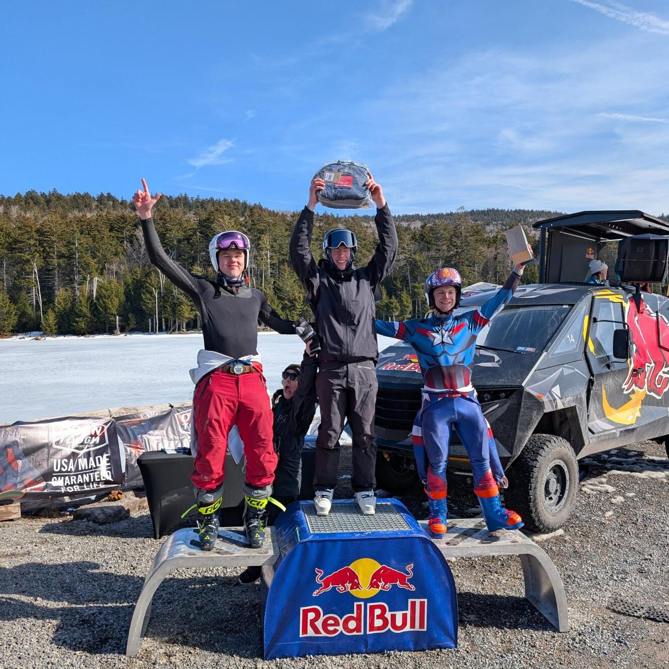 The top spot of the day came from youngblood Sam Glenn, buttering his run in a brisk 42.21 seconds and styling a huge 540 spin on the finish jump. He claimed his victory skiing switch across the finish line!